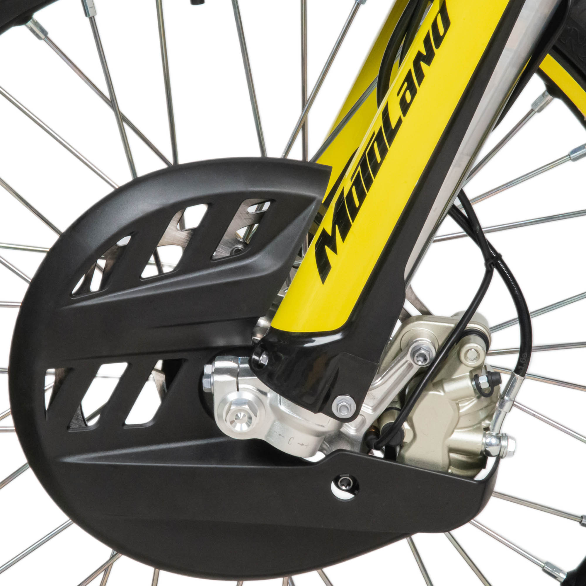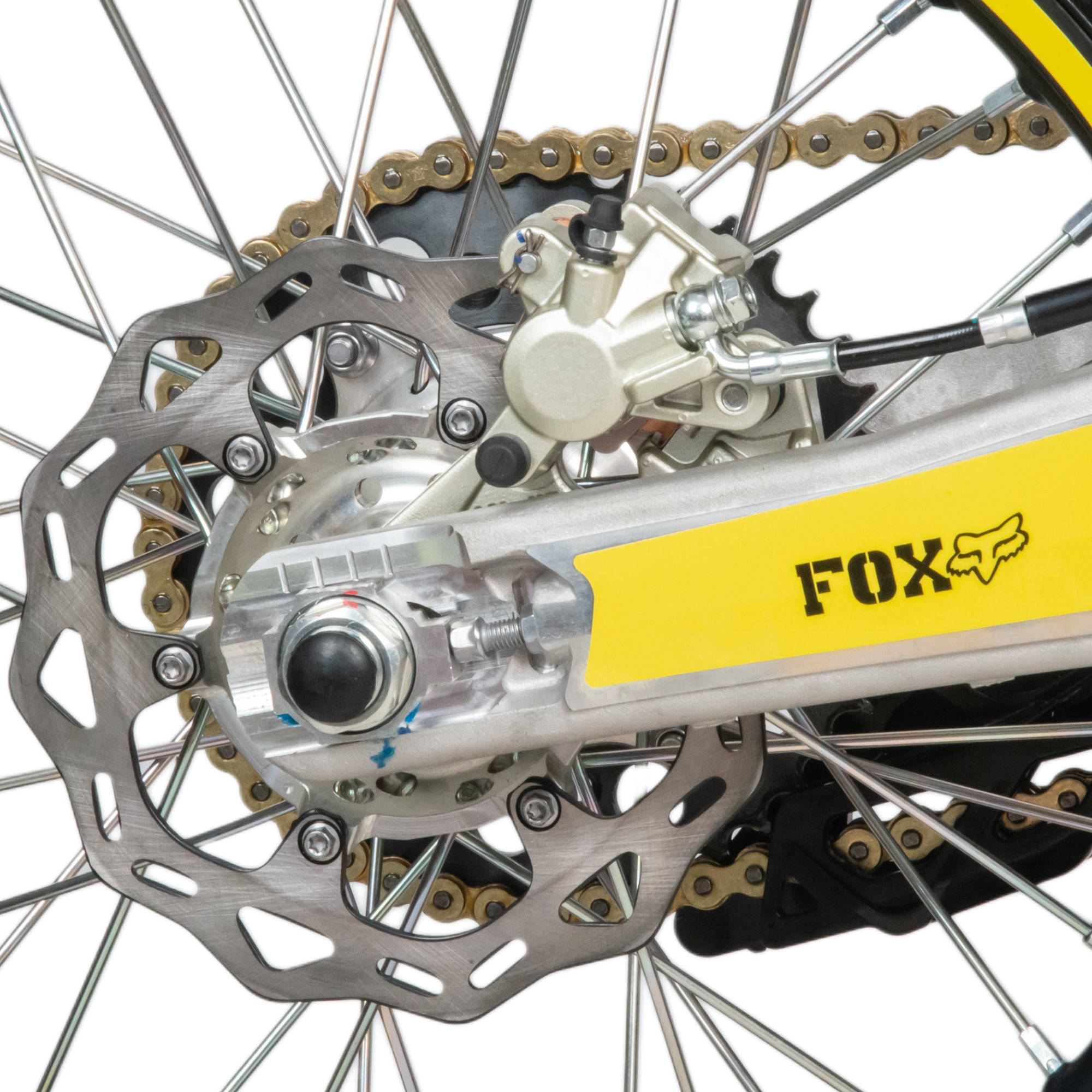 Выхлопная система с резонатором, глушитель алюминиевый. Телескопическая вилка с регулировками перевернутого типа, с усиленными траверсами, позволяет легко преодолевать ямы, ухабы и другие неровности. Задняя подвеска с прогрессией, моноамортизатор с регулировками (с бачком), маятник алюминиевый. Укомплектован: защитой рук, защитой руля, защитой торм. Диска, приборной панелью, светодиодной фарой.